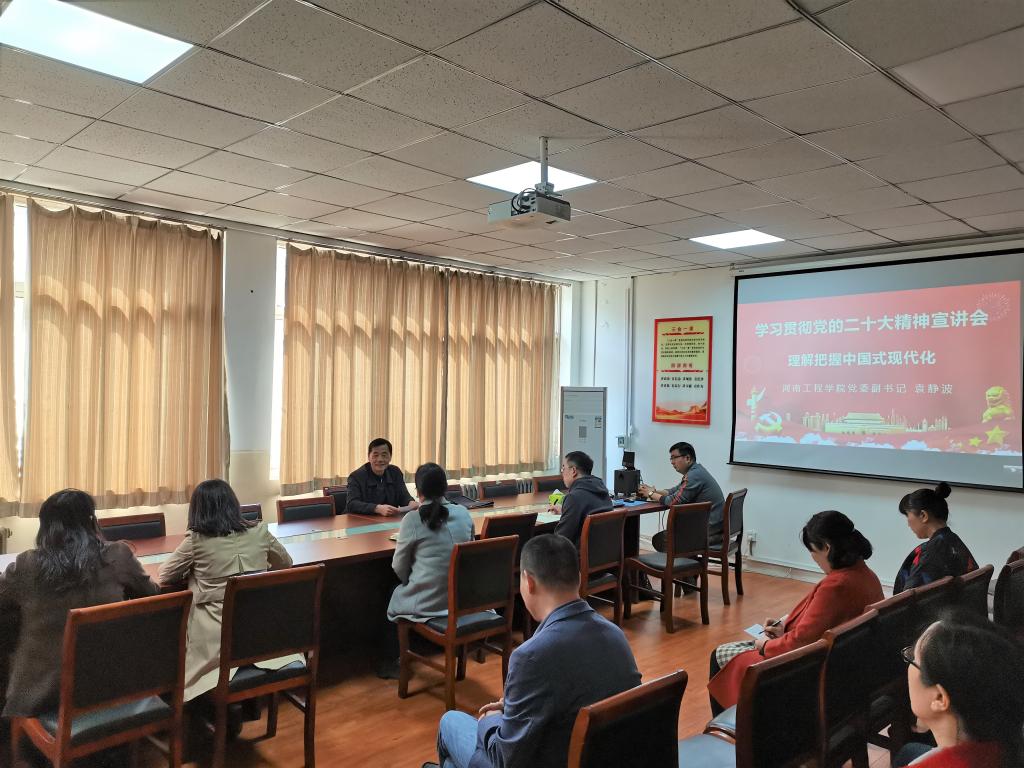 宣讲会上,袁静波以“理解把握中国式现代化建设”为题,围绕现代化国家的十条标准,着重讲解了中国特色的现代化。他认为,中国式现代化是中国共产党领导的社会主义现代化,是具有中国特色、符合中国实际、在中华大地上实现的现代化。党的二十大报告系统阐述了中国式现代化的五大特征:人口规模巨大的现代化,全体人民共同富裕的现代化,物质文明和精神文明相协调的现代化,人与自然和谐共生的现代化,走和平发展道路的现代化。“中国式现代化”的提出是与我国新时期“两步走”发展战略紧密相连的。党的二十大报告擘画了全面建成社会主义现代化强国的宏伟蓝图,我们要深入学习领会党的二十大精神实质,用先进理论武装头脑,确保党的二十大精神在新葡京官网落地生根、开花结果,不断开创各项事业发展新局面。会上,袁静波还结合外语学院的实际情况,为学院下一步发展指明了方向。