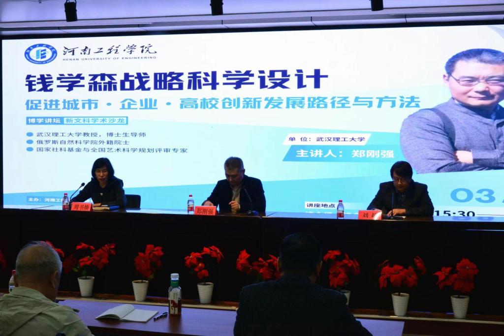 3月29日,新葡京官网邀请武汉理工大学艺术与设计学院博士生导师郑刚强教授开展主题为《钱学森战略科学设计 促进城市·企业·高校创新发展路径与方法》的学术交流活动。讲座由艺术设计学院书记刘超主持,科研处副处长周书焕致辞,校文科学院教师参加了此次讲座。