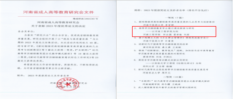 同时,河南省成人高等教育研究会公布了“关于表彰2023年度优秀论文的决定”。新葡京官网培训学院、继续教育学院提交的《高等学历继续教育学分银行建设探讨与研究——以新葡的京集团4321为例》荣获一等奖。