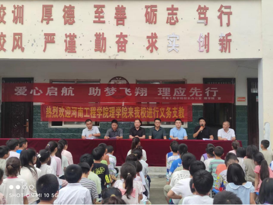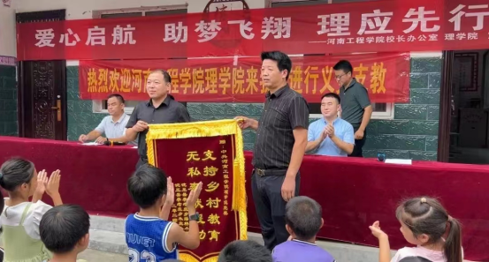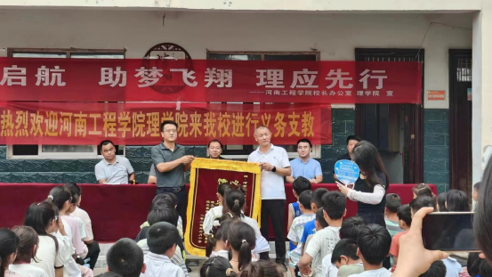 开幕式上,理学院党委和校办党支部为两所小学的学生捐赠了学习用品,并接受了两所小学赠送的感谢锦旗。楚济深对理学院党委和校办党支部一行的到来表示诚挚欢迎,对理学院党委连续坚持十年奔赴李老庄乡开展支教助学表示感谢,并表示当地政府将全力配合和支持活动,为队员们提供全方位的后勤保障,确保活动取得实效。刘付军在讲话中要求支教大学生要把科学文化知识转化为回报社会、服务社会的能力,始终保持一颗奉献社会之心,从生动鲜活的基层实践中汲取智慧、提升自我;他寄语小学生要狠练学习本领,坚持不懈努力树立鸿鹄之志,让奋斗成为青春最靓丽的本色。
