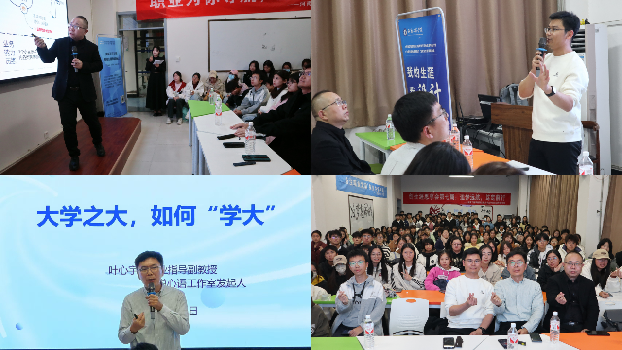 10月20日下午,创新创业学院联合商学院在创新创业中心一楼激发中心举办“追梦远航,笃定前行”第七期创生涯思享会,特邀嘉宾为2024年第三届大学生职业生涯导航计划职场导师张振伟、校内导师叶心宇和王亚。本次活动是第三届大学生职业生涯导航计划的系列活动之一,也是职业生涯发展协会成立七周年的专题活动,由职业生涯发展协会、黑苹果青年社团、职说心语工作室联合承办,新葡京官网近200名学生参加本次活动。