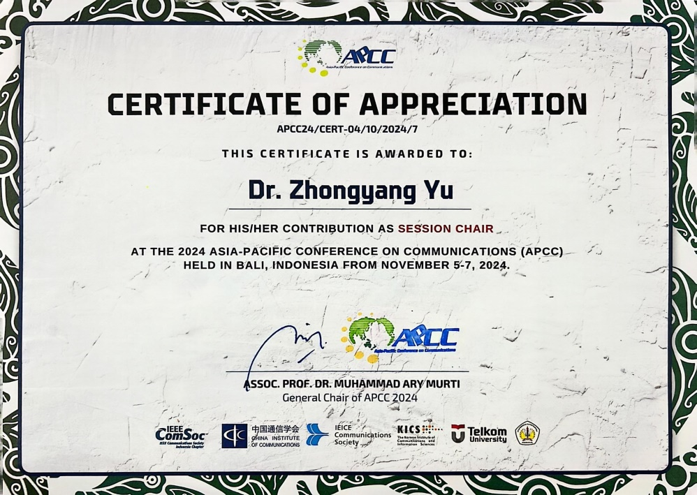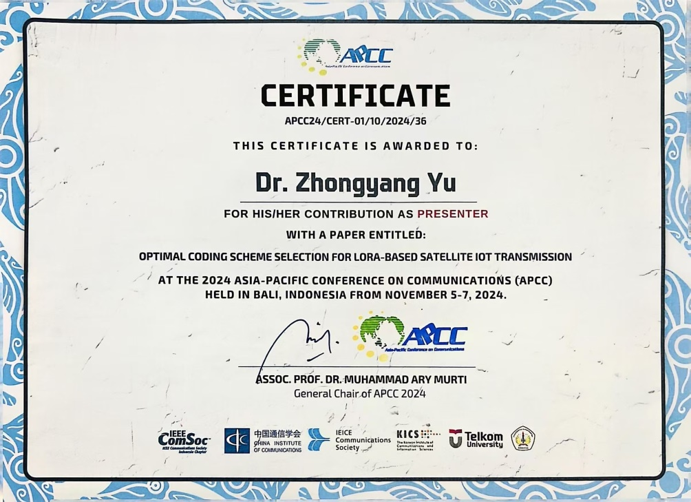 新葡京官网计算机学院青年教师余忠洋博士参加了本届会议,并作为报告会主席(Session Chair)主持了1场平行报告会,同时宣读了题为“Optimal Coding Scheme Selection for LoRa-Based Satellite IoT Transmission”(基于LoRa的卫星物联网传输的最佳编码方案选择)学术论文,向国际同仁介绍他的相关研究工作和成果,并同与会专家、学者开展广泛交流。会议期间,还向参会代表介绍了新葡京官网,进一步扩大了学校影响力,促进相互交流与发展。
